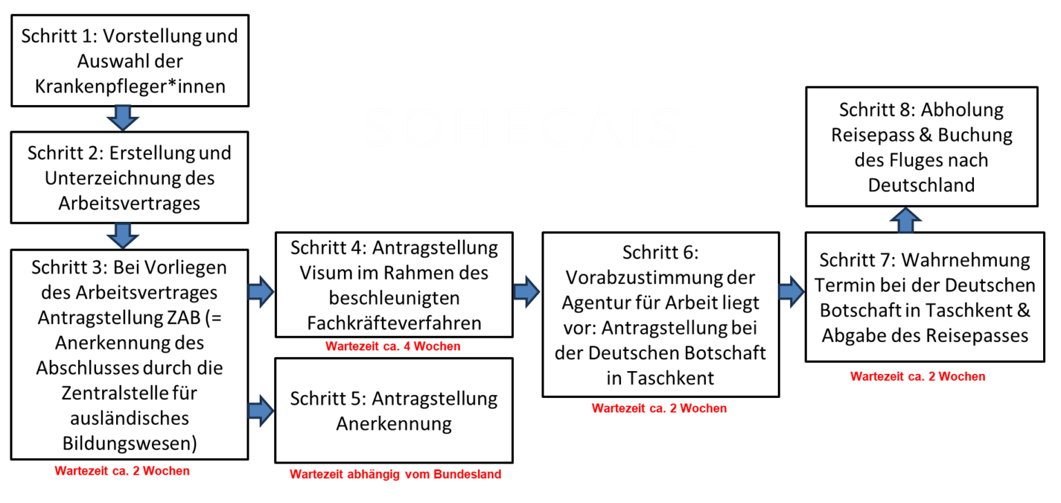Sohecais GmbH Germaniyada hamshiralik xodimlarini integratsiya qilish uchun har tomonlama yordam ko’rsatadi. Bunga quyidagilar kiradi: – Ishga joylashtirilgandan so’ng, biz parvarishlovchilarning nemis tilini yaxshi bilishi va ham professional, ham shaxsiy sharoitlarda samarali muloqot qila olishlarini ta’minlash uchun nemis tili kurslariga yo’llanmalarni taklif qilamiz. – Biz parvarishlovchilarga ularning xorijiy malakalarini tan olishda yordam beramiz va ularni butun jarayon davomida boshqaramiz. – Har bir vasiyga moslashish va integratsiyalashuvda yordam beradigan ustoz tayinlanadi. Bunga turar joy topish, rasmiylar bilan ishlash va boshqa kundalik muammolarni hal qilishda yordam berish kiradi.
